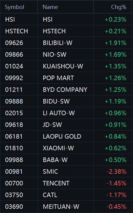 In terms of star stocks, Bilibili and NIO rose 2%; Kuaishou, Pop Mart, BYD, Baidu, and Li Auto rose 1%; JD.com rose 0.9%; Xiaomi rose 0.6%; Alibaba rose 0.5%; while SMIC and Tencent fell 2%; CATL fell 1%.