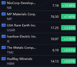 Rare Earth Stocks Jump. NB up 11%; MP up 7%; USAR up 3%; IE up 1%.