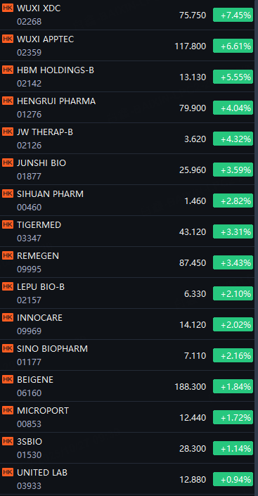 On October 27, Hong Kong Stock Market's innovative pharmaceutical concept stocks rose at market open, with WUXI XDC and WUXI AppTec up 7%; HBM Holdings up 6%; Hengrui Pharma and JW Therap up 4%; TIGERMED, Junshi and RemeGen increased more than 3%.