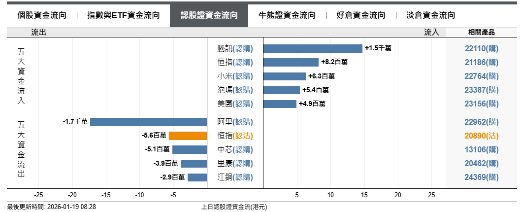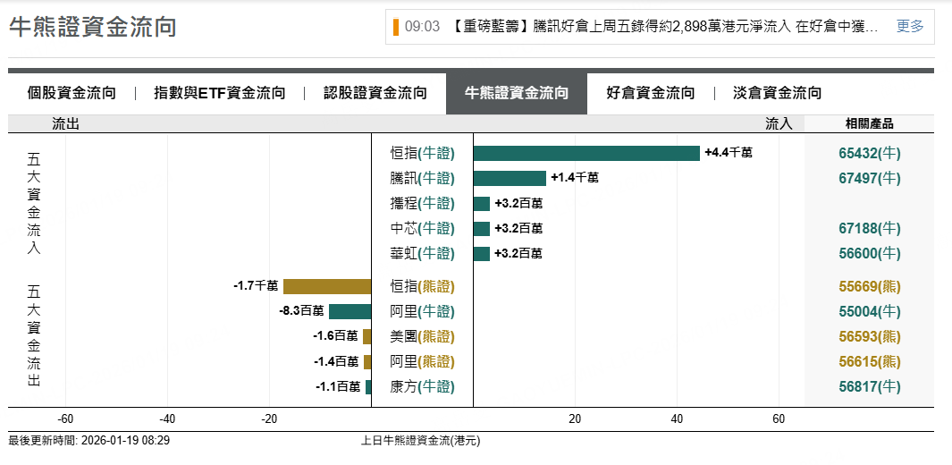 恒指牛證上日流入4400萬元,騰訊牛証流入1400萬元,攜程牛證流入320萬元。