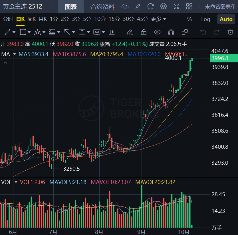 10月7日,纽约期金历史首次触及4000美元/盎司整数大关,年内大涨逾50%。现货黄金报3976.94美元/盎司,同样创下历史新高。
