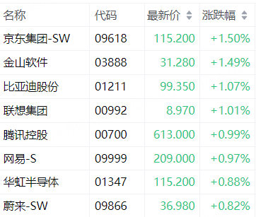 权重科技股普遍上涨,其中,京东涨1.5%,百度飘绿;再创历史新高!现货黄金升破5200美元,黄金股涨势不止,赤峰黄金涨4.5%,招金矿业、紫金矿业等多股涨超2%。