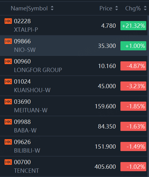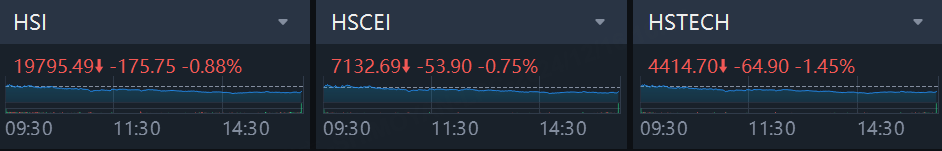 Hong Kong stock market closed lower. The Hang Seng Index (HSI) fell by 0.88%, the Hang Seng China Enterprises Index (HSCEI) decreased by 0.75%, the Hang Seng Tech Index (HSTECH) dropped by 1.45%, while the Hang Seng China-Affiliated Corporations Index (HSCCI) slightly increased by 0.03%.