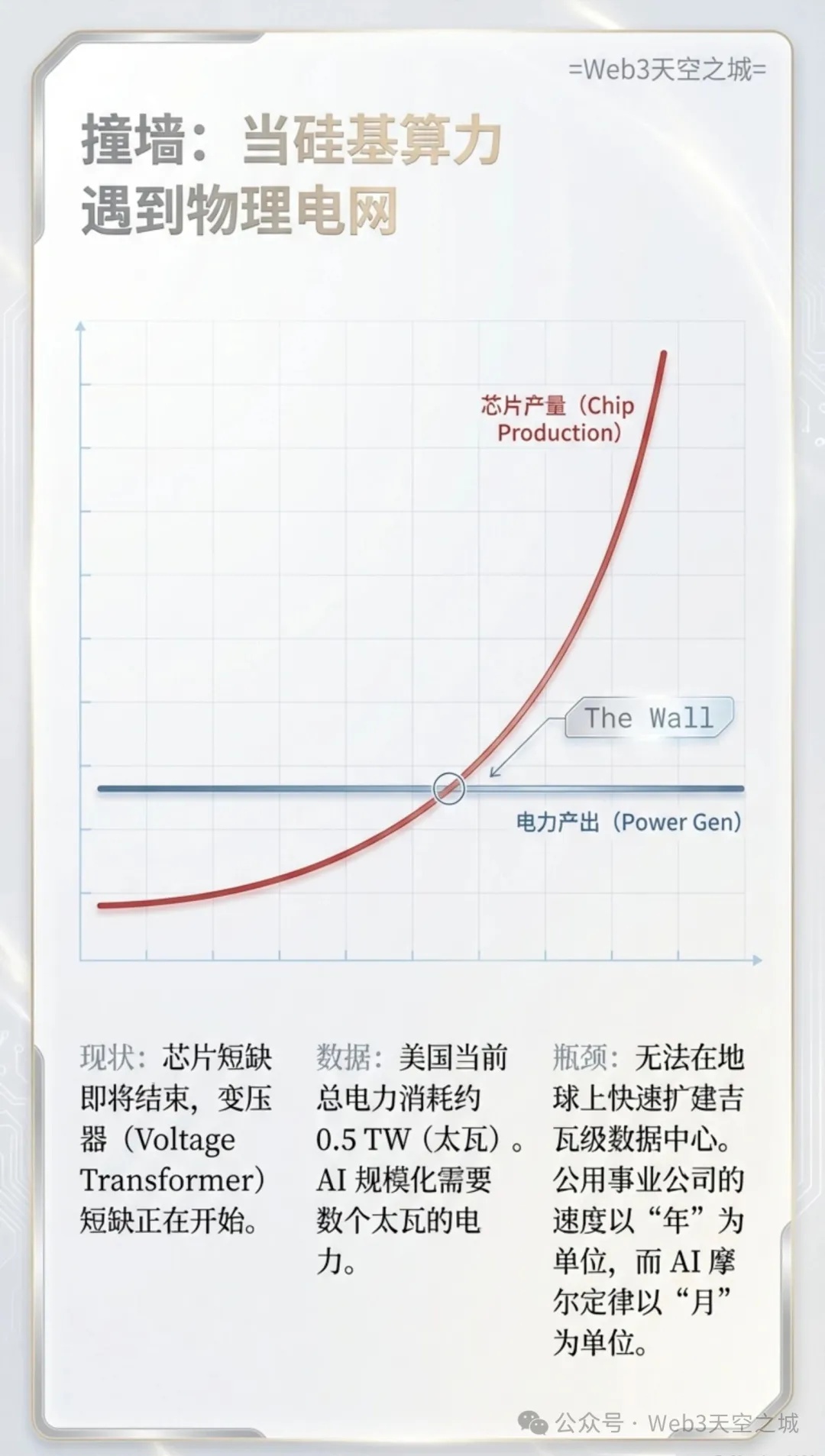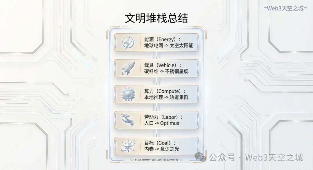 在马斯克看来,地球上的 AI 竞赛正撞上一堵无形的墙:电力产出的停滞。尽管芯片产出呈指数级增长,但由于电网升级缓慢、公用事业公司效率低下,地球上的能源供应已成为 AI 规模化的最大限制。他尖锐地指出,“芯片产出正在飞速增长,但电力产出却几乎持平。你打算如何开启这些芯片?靠魔幻的电力渡船吗?” 这种供需错位促使他将目光投向了地球大气层之外。
