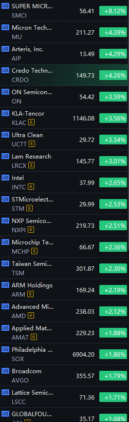 Chip Stocks Rallied. SMCI up 8%; Micron and Credo up 4%; On Semi and Lam Research up 3%; Intel, ARM and AMD up over 2%.