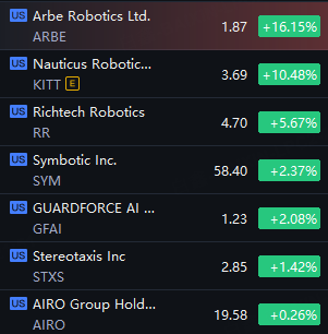 Robotics Stocks Shined. Arbe Robotics up 16%; Nauticus Robotics up 10%; Richtech Robotics up 5%; Symbotic and GuardForce up 2%.