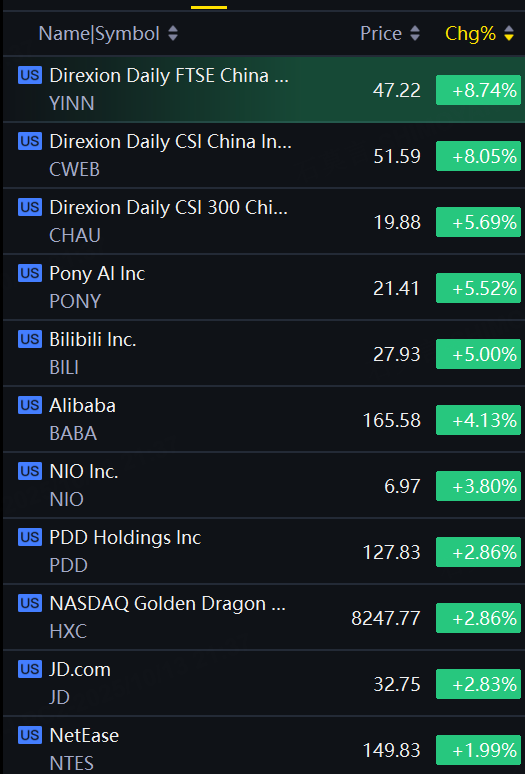 Chinese ADRs and ETFs rebounded on Monday. YINN, CWEB up over 8%; CHAU up nearly 6%; Alibaba, NIO up around 4%; PDD, JD up nearly 3%.