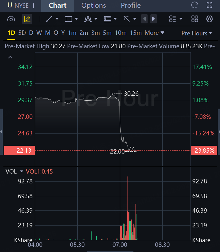 Unity Software dropped 24% in premarket trading Wednesday. Shares closed Tuesday down 34% on the year.