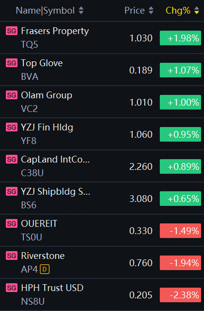 SG Morning Call | STI Rises 0.3%; Frasers Property up 2%; Top Glove, Olam Group, YZJ Fin Hldg up 1% Each; HPH Trust, Riverstone Down About 2%