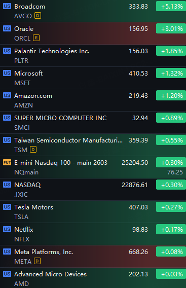 Big Tech Stocks Gained. Broadcom Up 5%; Oracle Up 3%; Palantir Up 2%; Microsoft, SMCI And Amazon Up 1%.