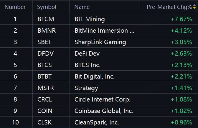 Crypto shares jumped on Wednesday. BIT Mining up nearly 8%; BitMine up 4%; SharpLink Gaming up 3%; DeFi Dev, BTCS, Bit Digital up over 2%; Strategy, Circle, Coinbase up 1%.