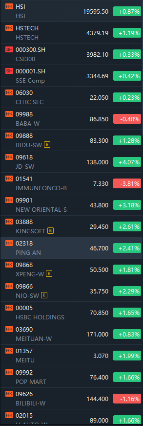 In terms of industry sectors, the Hong Kong education sector saw a significant increase, with New Oriental-S rising by 3.18%. The SaaS concept stocks also performed well, with Kingsoft up by 2.61%. The insurance sector showed strong performance, with Ping An increasing by 2.41%.