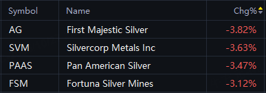 Silver stocks fell in Monday trading as spot silver fell 3% to $47.08/Oz. First Majestic Silver and Silvercorp Metals fell 4%; Pan American Silver fell 3%.