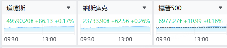 美东时间周一,美股三大指数集体小幅收涨,标普500指数和道琼斯指数双双创下历史新高。截至收盘,道指涨86.13点,涨幅为0.17%,报49590.20点;纳指涨62.56点,涨幅为0.26%,报23733.90点;标普500指数涨10.99点,涨幅为0.16%,报6977.27点。
