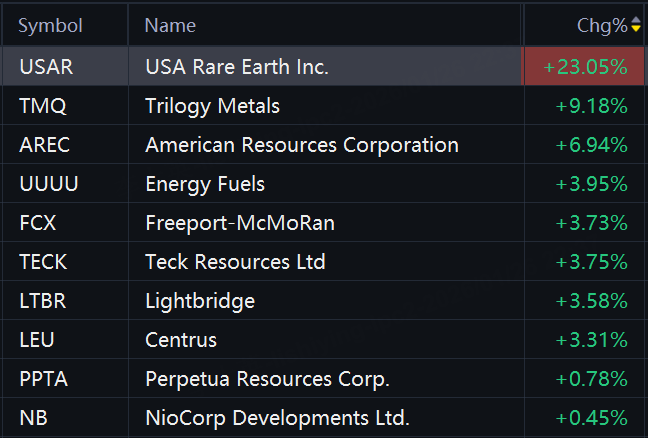 Rare earth stocks jumped in morning trading. USA Rare Earth rose 23%; Trilogy Metals rose 9%; American Resources rose 7%; Energy Fuels, Freeport-McMoRan, Teck Resources, and Lightbridge rose 4%.