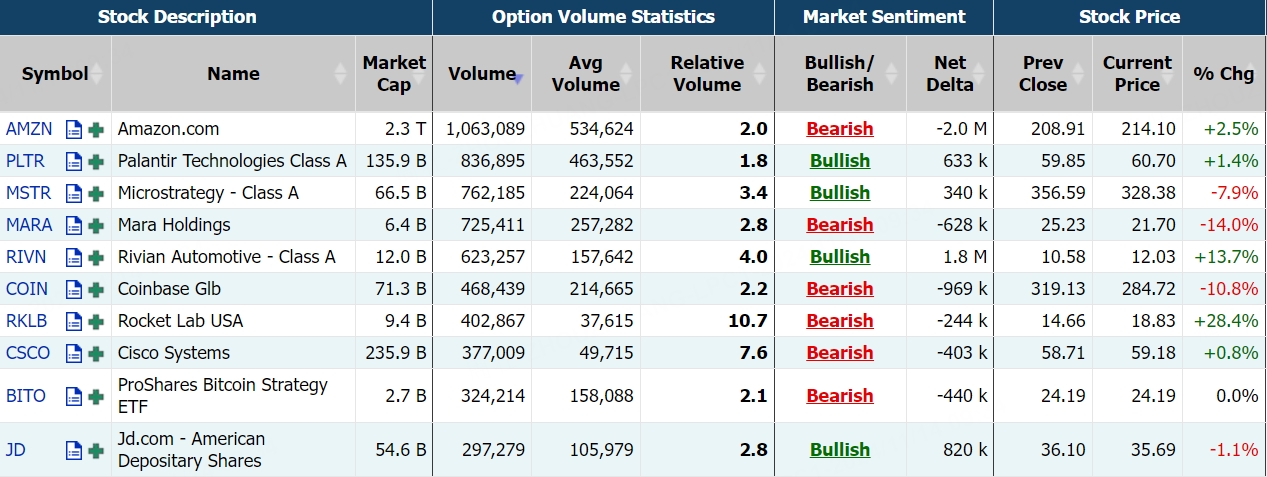 周三,期权市场总成交量4956.73万张合约,高于90日均量;加密货币概念股期权成交量环比大增,看涨期权占比均位居高位;亚马逊、Palantir股价续刷历史新高,期权成交量激增>>