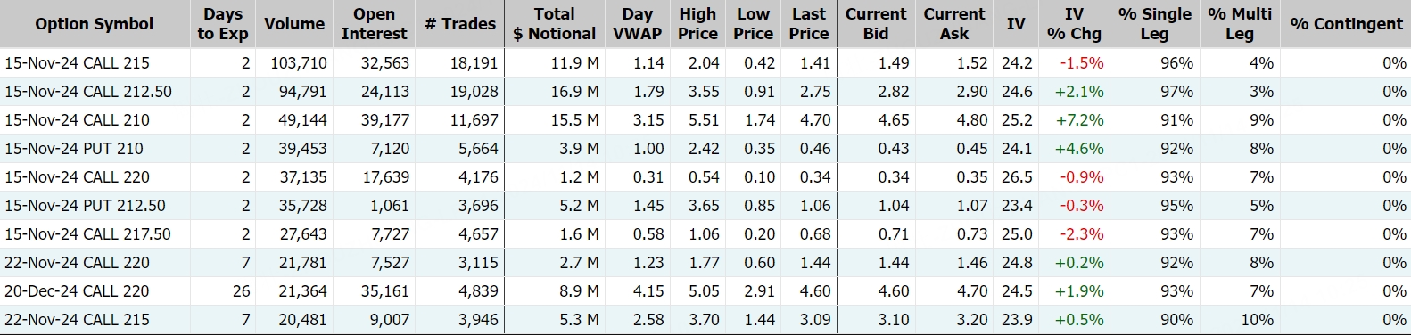 亚马逊收涨逾2%,股价创历史新高。“黑五”与“网络星期一”预热开启,网购规模有望再创新高。期权方面,亚马逊当日成交106.31万张合约,环比前一交易日增加近99%,看涨期权占比75.7%,其中于本周五到期的215美元行使价的看涨期权成交居前,成交10.37万张。 $AMZN 20241115 215.0 CALL$