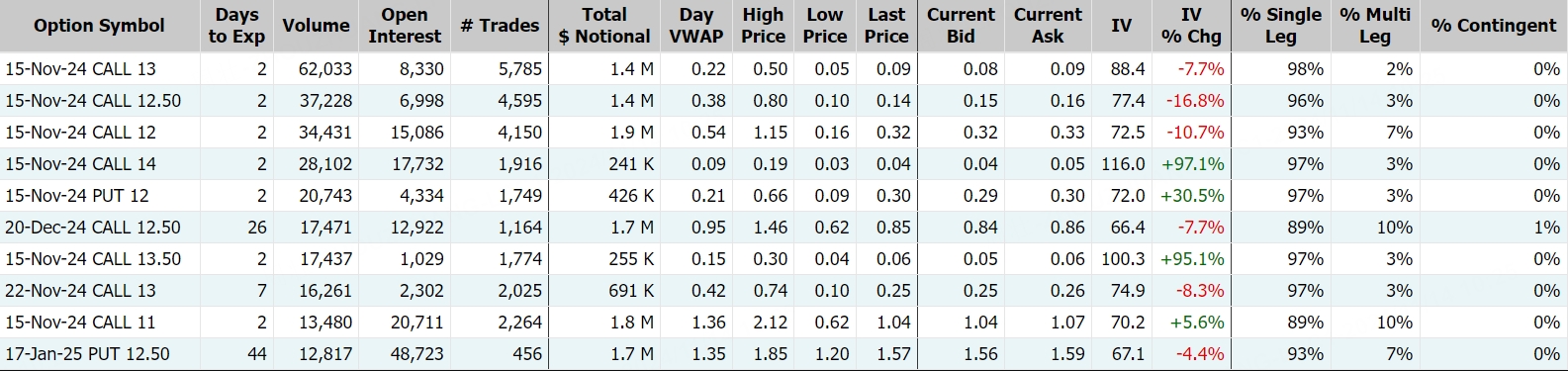 Rivian收涨近14%,盘中刷新9月20日以来高位。再加码8亿!大众将豪掷58亿美元推进与其合作。期权方面,Rivian当日成交62.33万张合约,环比前一交易日增加逾455%,看涨期权占比76.5%,其中于本周五到期的13美元行使价的看涨期权成交居前,成交6.2万张。 $RIVN 20241115 13.0 CALL$