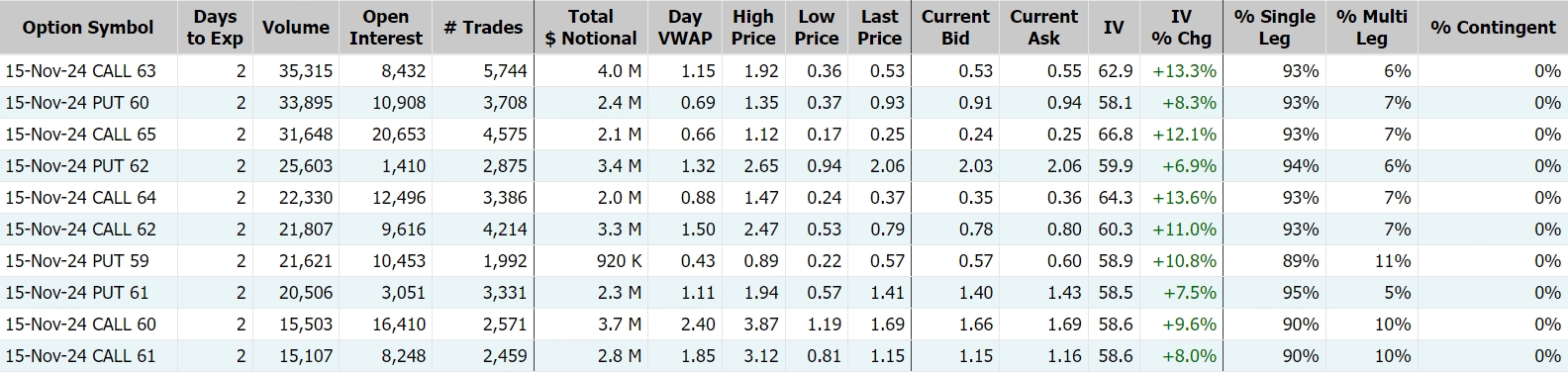 Palantir收涨逾1%,股价创历史新高。该公司宣布将与力拓集团的多年企业协议再延长4年。期权方面,Palantir当日成交83.69万张合约,环比前一交易日增加逾62%,看涨期权占比57.3%,其中于本周五到期的63美元行使价的看涨期权成交居前,成交3.5万张。 $PLTR 20241115 63.0 CALL$