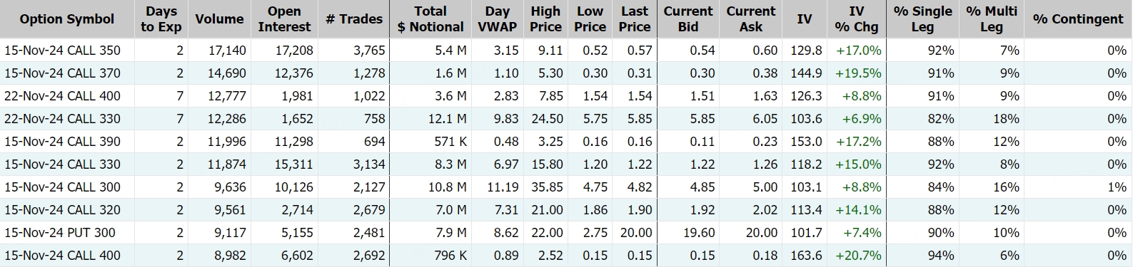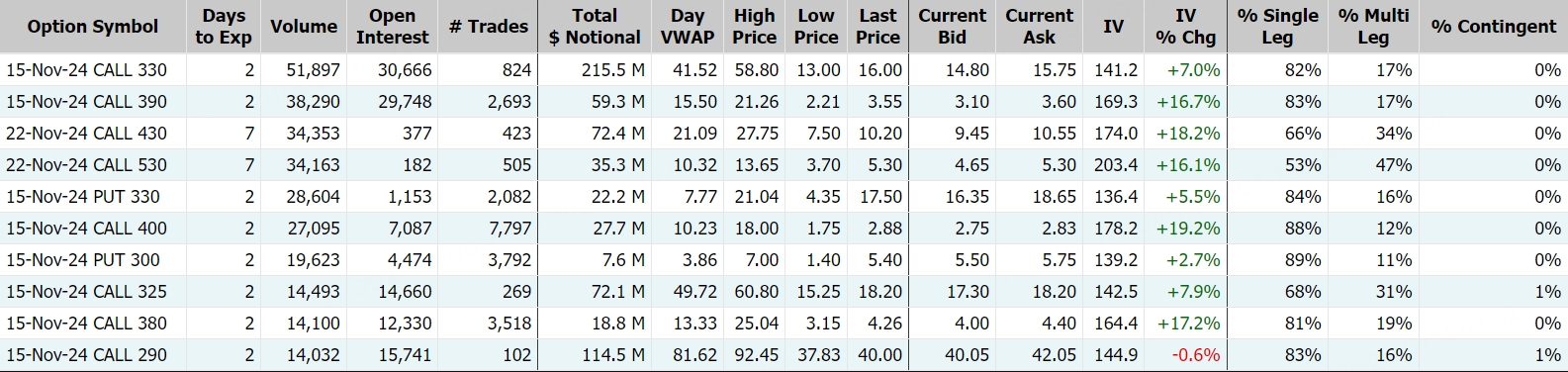 MicroStrategy跌近8%,当日期权成交76.47万张合约,环比前一交易日增加逾49%,看涨期权占比70.6%,其中于本周五到期的330美元行使价的看涨期权成交居前,成交5.19万张; $MSTR 20241115 330.0 CALL$