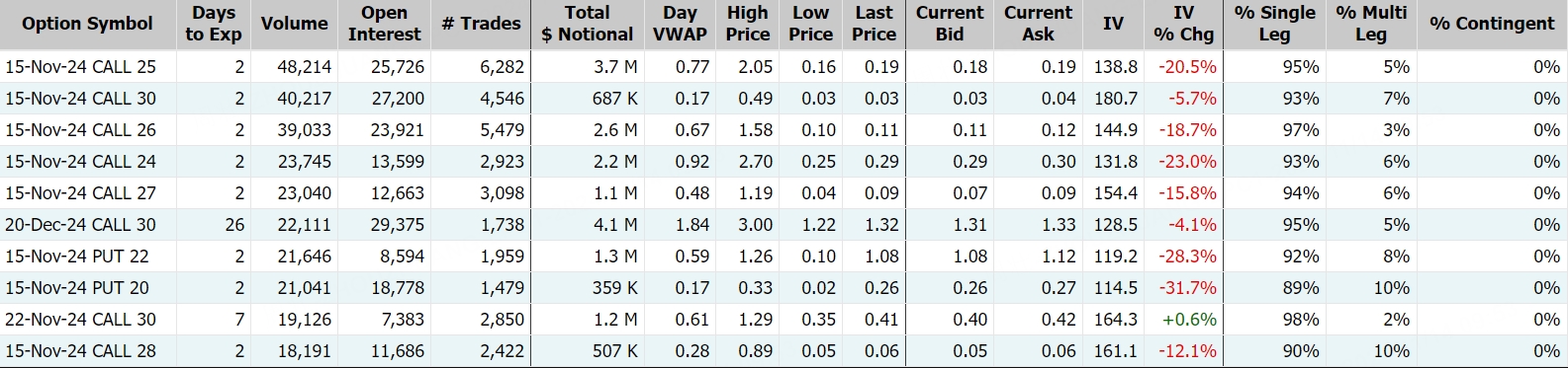 Marathon Digital跌近14%,当日期权成交72.81万张合约,环比前一交易日增加逾28%,看涨期权占比73.8%,其中于本周五到期的25美元行使价的看涨期权成交居前,成交4.82万张; $MARA 20241115 25.0 CALL$