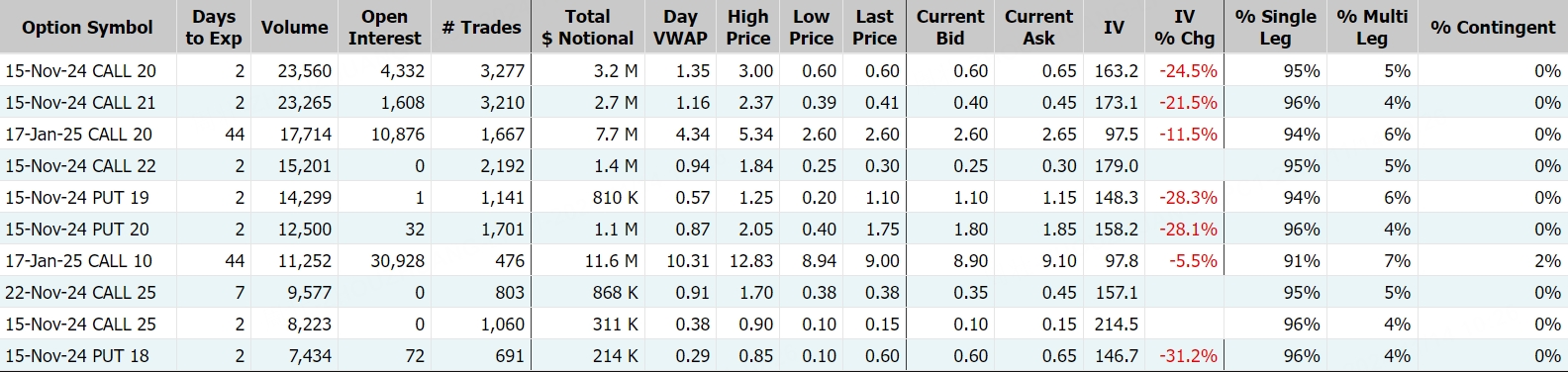 Rocket Lab收涨逾28%,股价创历史新高。该公司第三季度业绩好于预期并获得800万美元合同。期权方面,Rocket Lab当日成交40.29万张合约,环比前一交易日增加逾342%,看涨期权占比76.5%,其中于本周五到期的20美元行使价的看涨期权成交居前,成交2.36万张。 $RKLB 20241115 20.0 CALL$