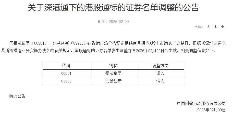2月9日,深交所公告,港股通标的证券名单发生调整并自2026年02月09日起生效,调入豪威集团、兆易创新。