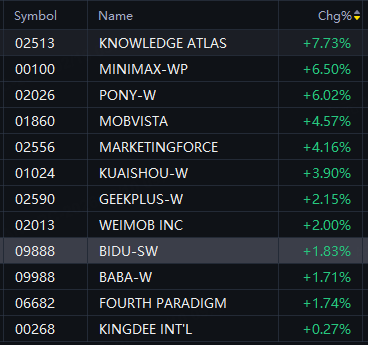 Knowledge Atlas up 8%; MiniMax up 7%; Pony AI up 6%; MOBVISTA up 5%; Kuaishou, Marketingforce up 4%; Alibaba, Baidu up 2%.