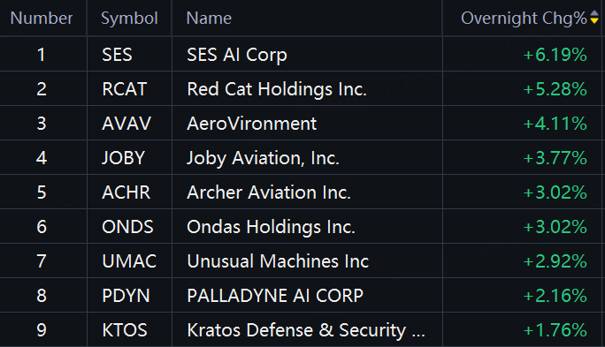 Drone makers shined in overnight trading. SES AI up over 6%; Red Cat up over 5%; AeroVironment, Joby Aviation up around 4%.