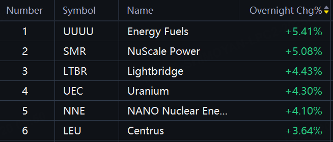 Nuclear stocks gained in overnight trading. Energy Fuels, NuScale Power up over 5%; Lightbridge, Uranium, NNE up over 4%.