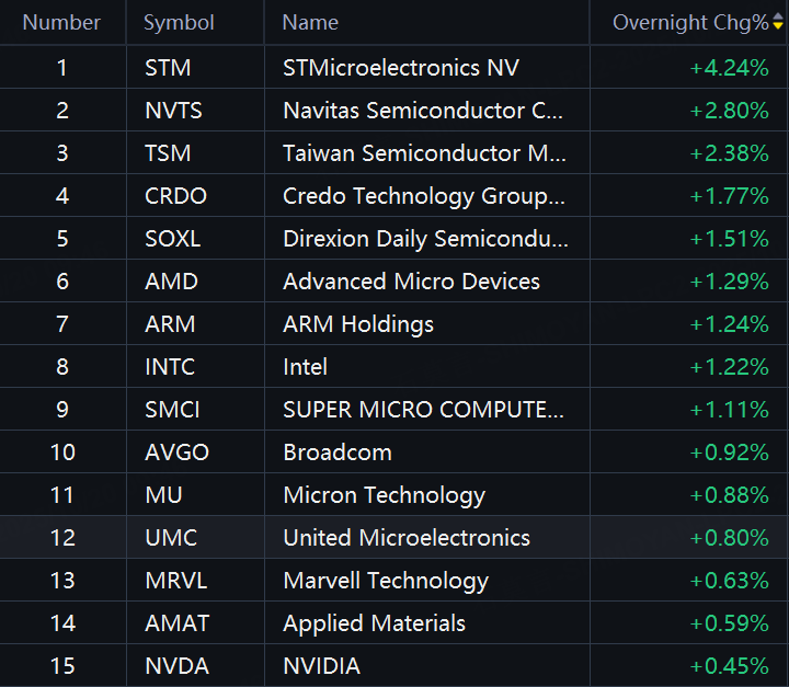 Chip stocks mostly jumped in overnight trading. STM up over 4%; Navitas, TSMC up over 2%; SOXL, AMD, Intel, SMCI up over 1%.