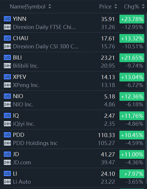 China ADRs & ETFs continued to fall in overnight trading. YINN fell 13%; CHAU fell over 10%; Bilibili dropped nearly 10%; XPeng, Nio fell 6%; iQiyi, PDD Holdings, JD.com fell over 4%.