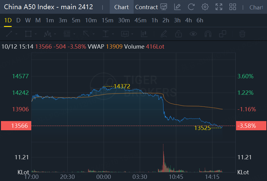 China A50 index futures fell 3.6% after a 4.6% rally in prior session.