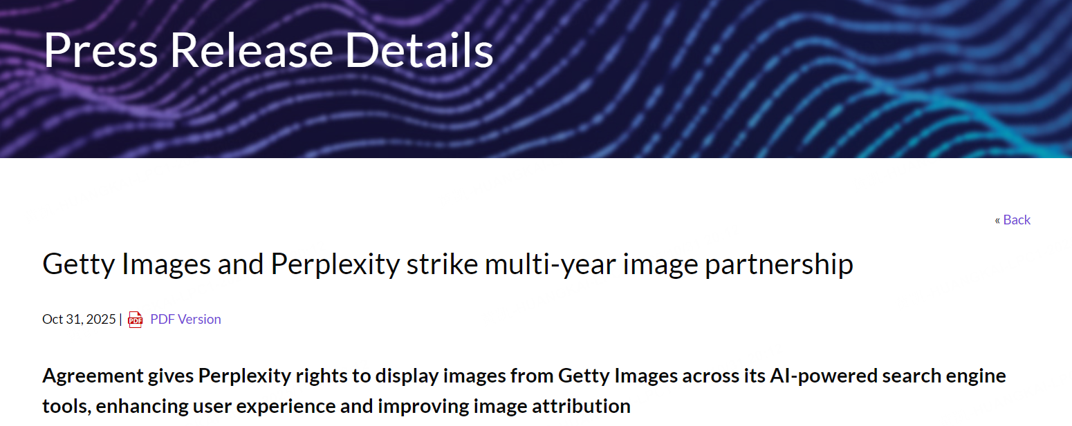 Getty Images与Perplexity达成全球多年期授权协议,允许Perplexity在其AI驱动的搜索和发现工具中展示Getty Images的高质量图片。