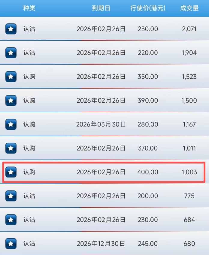 期权方面,泡泡玛特认购合约的行权价格都比较引人注目。其中,一份2月26日到期的CALL,行权价高达400港元,较现价有60%以上的涨幅空间。