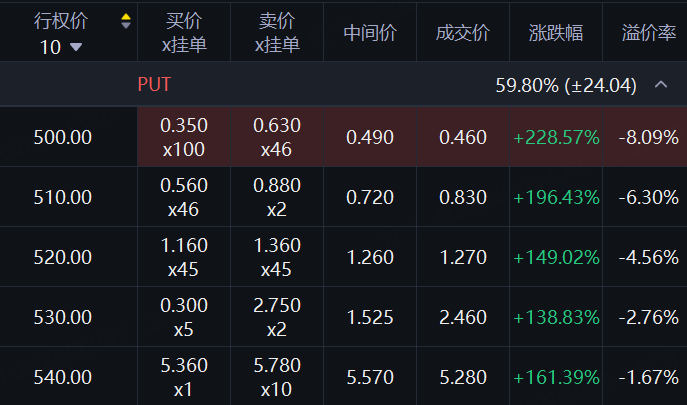 腾讯PUT的价格普涨,其中一份2月6日到期的认沽合约,行权价500港元,价格涨幅达228.57%。