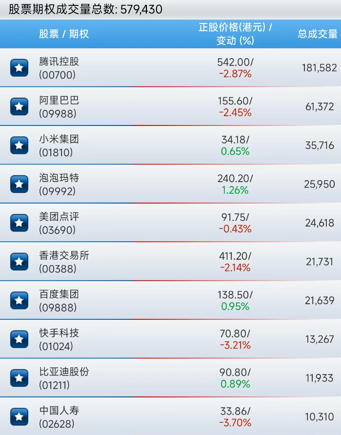 港股股票期权上午成交579430张合约。其中, 腾讯控股 期权成交量排名第一,阿里巴巴、小米、泡泡玛特、美团等科技股紧随其后。