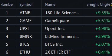 Ether-holding company shares shined. 180 Life Sciences Corp up 9%; GameSquare and Upexi, Inc. up 5%; BitMine Immersion Technologies Inc. up 4%.