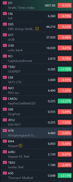 Singapore stocks opened lower on Tuesday. STI fell 0.4%, SIA fell 0.8%, Clar fell 0.8%, OUEREIT rose 1.8%.
