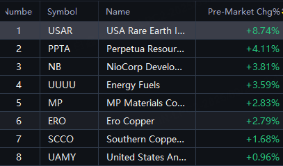 Rare Earth Stocks Jump. USAR Up 9%; PPTA Up 4%; NB and UUUU Up 3%; MP and ERO Up 2%.