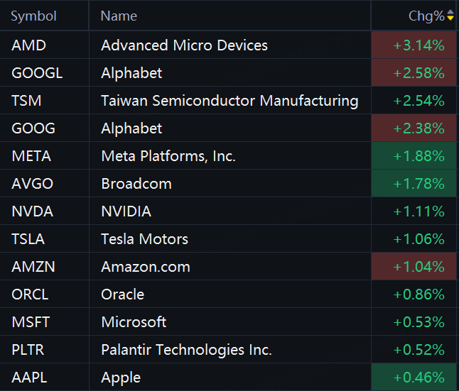 Big tech stocks jumped in morning trading. AMD, Alphabet, and TSMC rose 3%; Meta and Broadcom rose 2%; Nvidia, Telsa, and Amazon rose 1%.