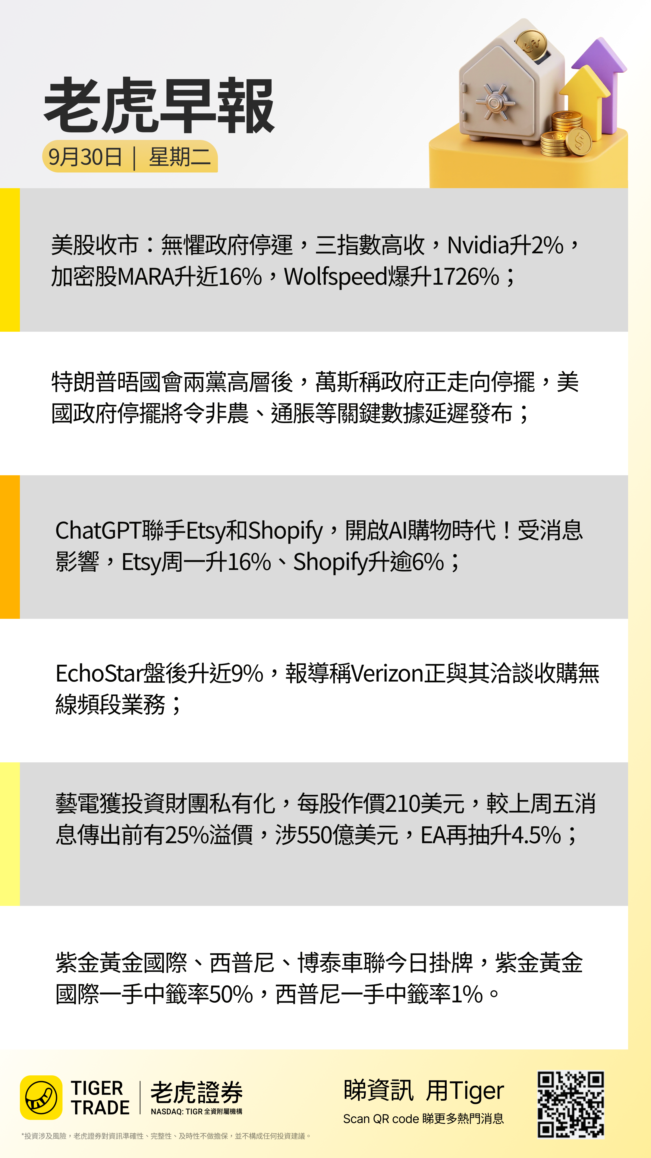 周一(9月29日),美股三大指数集体上涨。截至收盘,道琼斯指数涨0.15%,报46316.07点;标普500指数涨0.26%,报6661.21点;纳斯达克综合指数涨0.48%,报22591.15点。