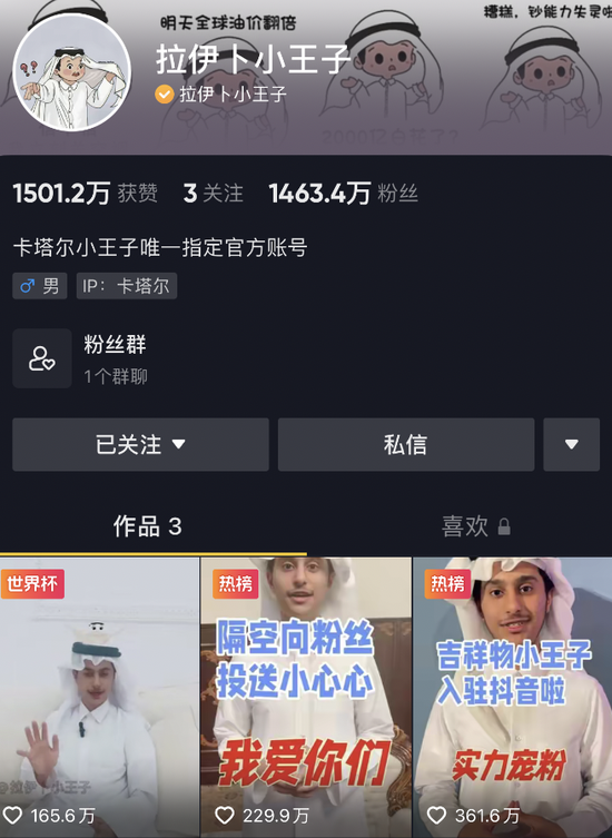 值得注意的是,据卡塔尔规划统计局数据,截至2022年10月,卡塔尔总人口为3020080人,也就是说,一天时间内卡塔尔小王子的抖音粉丝“涨了三个卡塔尔”。