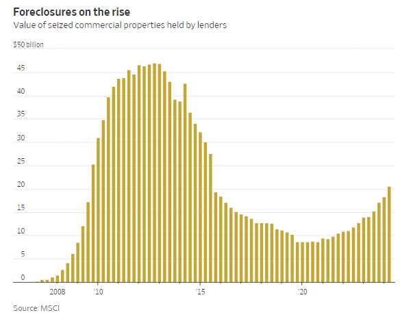 Office is by far the most troubled property class. In the second quarter, the volume of office property seized in foreclosures and other actions was up about $5 billion from the second quarter of 2023, MSCI said. Apartment buildings, which have been hit hard by the increase in interest rates and the crush of new supply, had a $975 million increase during the same period.
