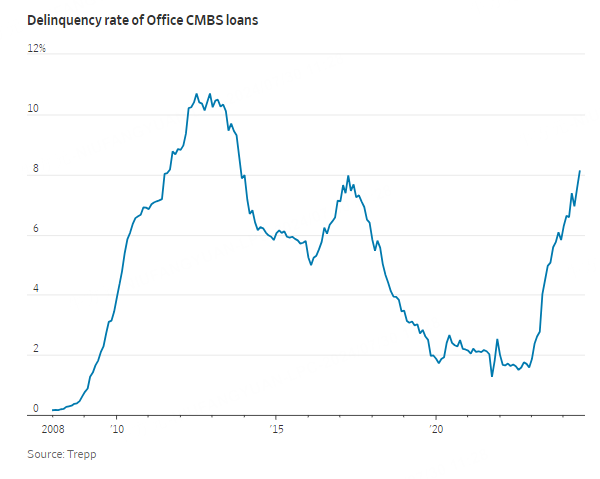 This month, the delinquency rate of office loans converted into securities increased to above 8% for the first time since November 2013, according to Trepp, citing data as of last week.