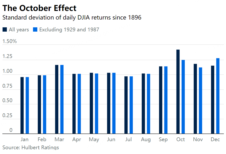 As measured by the standard deviation of the Dow Jones Industrial Average's daily returns since its inception in 1896, October's volatility is 34% higher than for the average non-October month. November is in second place in the volatility rankings, and March is in third. September comes in fourth, as you can see from the accompanying chart.