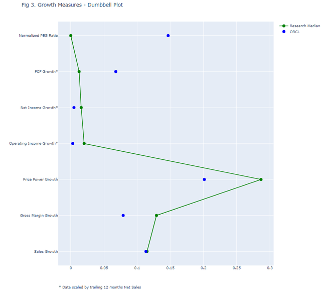 图3仅部分反映了这一额外的盈利能力。如果甲骨文能够实现研究公司中位数的销售增长指标,那么毛利率就不会达到同样的水平,从而导致价格力增长指标较弱。该指标结合了收入和毛利率的增长,与相对较低的需求弹性推动的更高利润销售直接相关。这种影响的一个解释与甲骨文的成熟度以及该公司似乎仍在努力提高组织效率有关。该公司最近公布了2022年和2024年的两项重组计划(预计财务费用将持续到2025年),这表明更健康的运营环境是一个困难点。另一方面,与其行业相比,甲骨文的盈利能力评级为A+,重点关注运营现金产生。