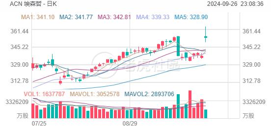 本周四(9月26日),全球知名IT服务公司埃森哲 盘初一度涨超8%,截至发稿报353.39美元,涨幅4.85%:
