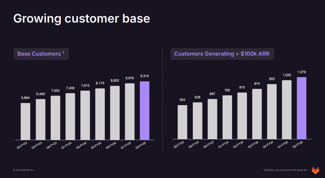 GitLab ( NASDAQ: GTLB ) 于 9 月公布了2025 财年第二季度的业绩,收入同比增长 31%,非 GAAP 营业收入在去年亏损后转为正值。该公司继续在企业领域深化渗透,增加了新标识并扩大了现有客户群,其 10 万美元以上的 ARR 客户群同比增长 33%,总客户数量达到 1076 人。