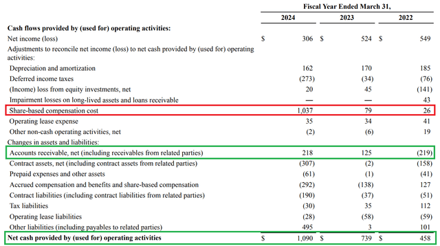 从2023财年到2024财年,应收账款总额也大幅下降,而同期销售额猛增超过20%。